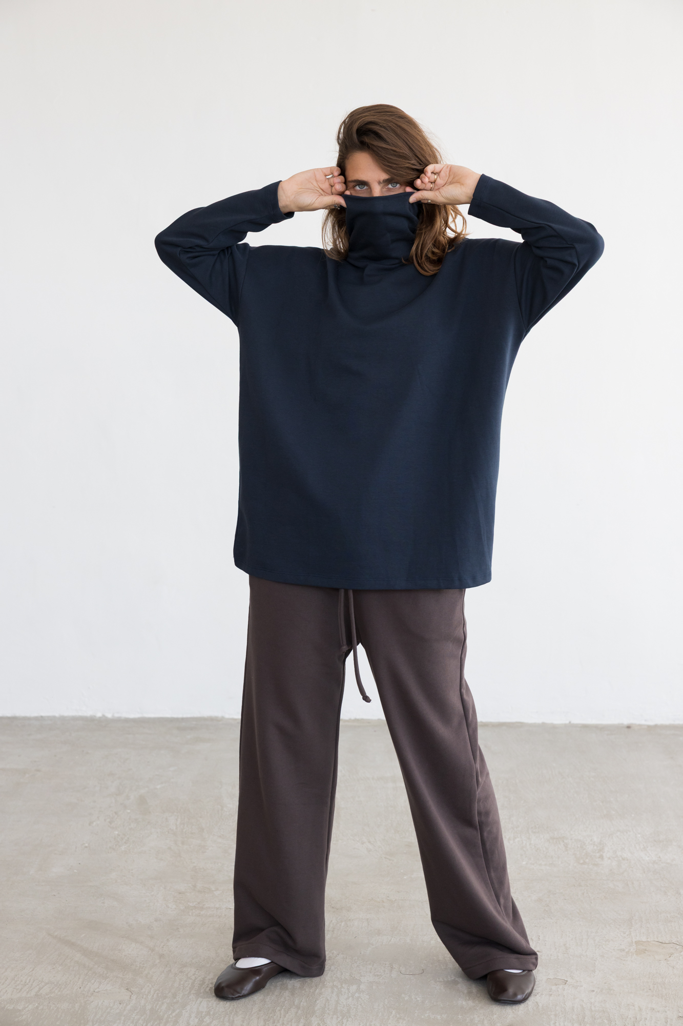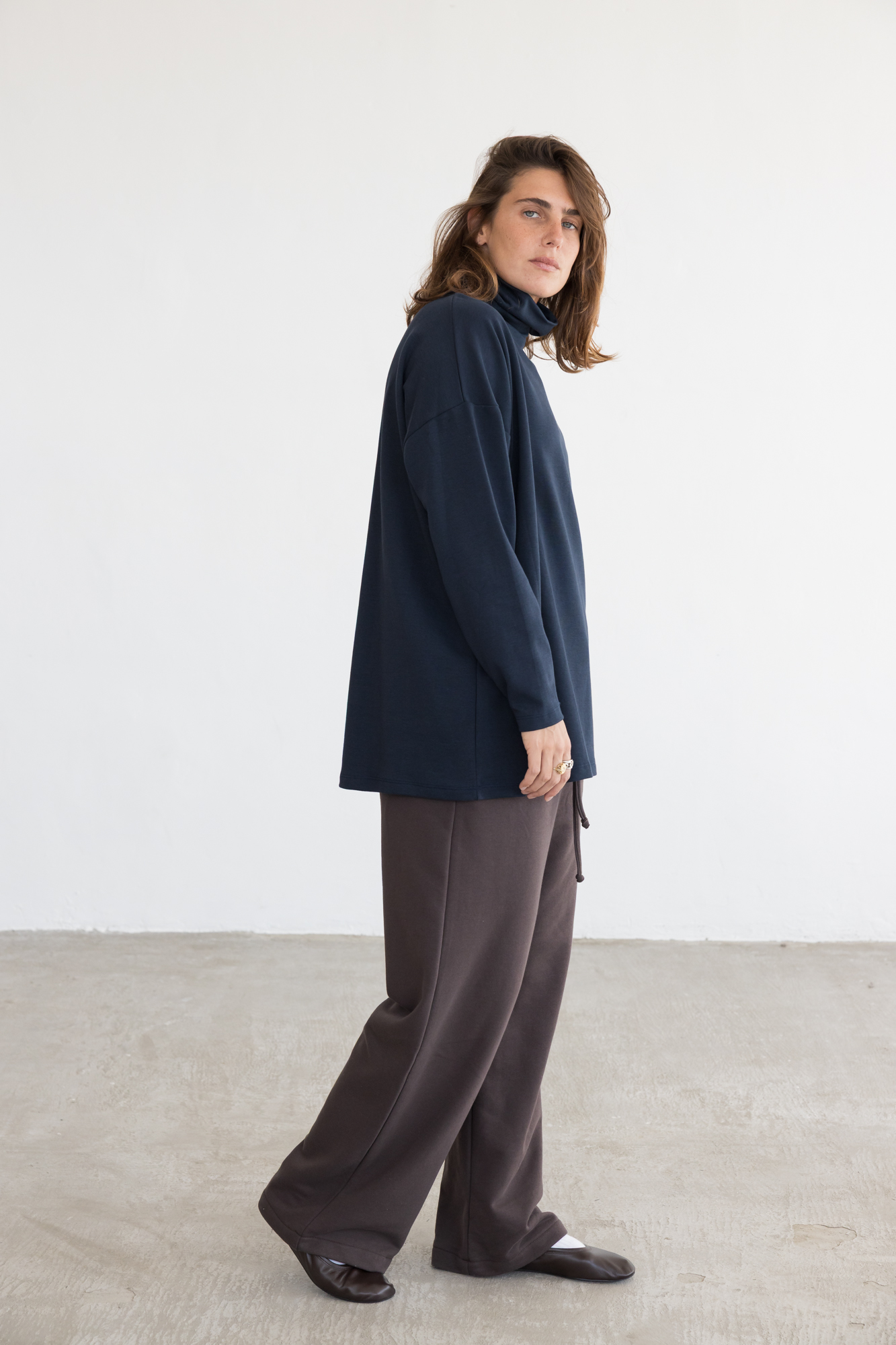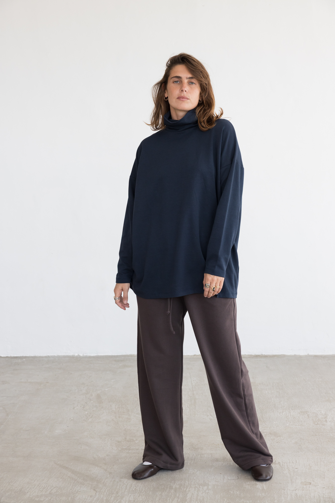 חולצה בגזרת אוברסייז עם צווארון גולף, אפשר ללכת עם צווארון גבוה או מקופל. גולף בייסיק לחרוש עליו שילווה אותך שנים קדימה.