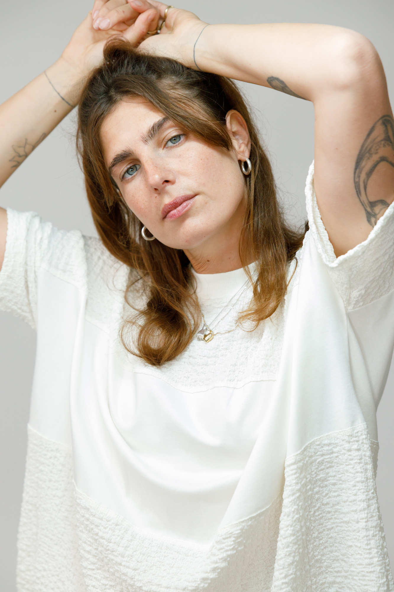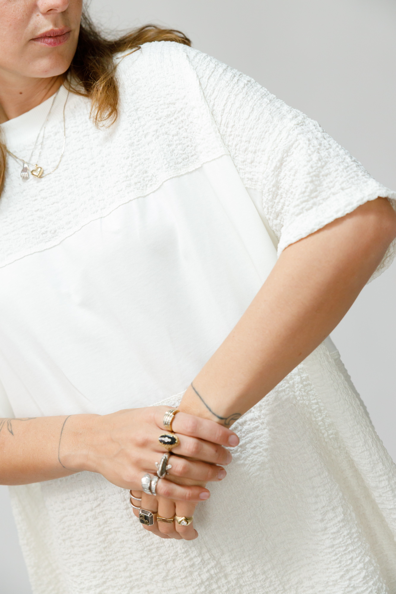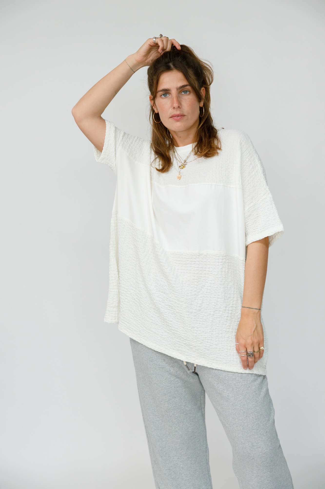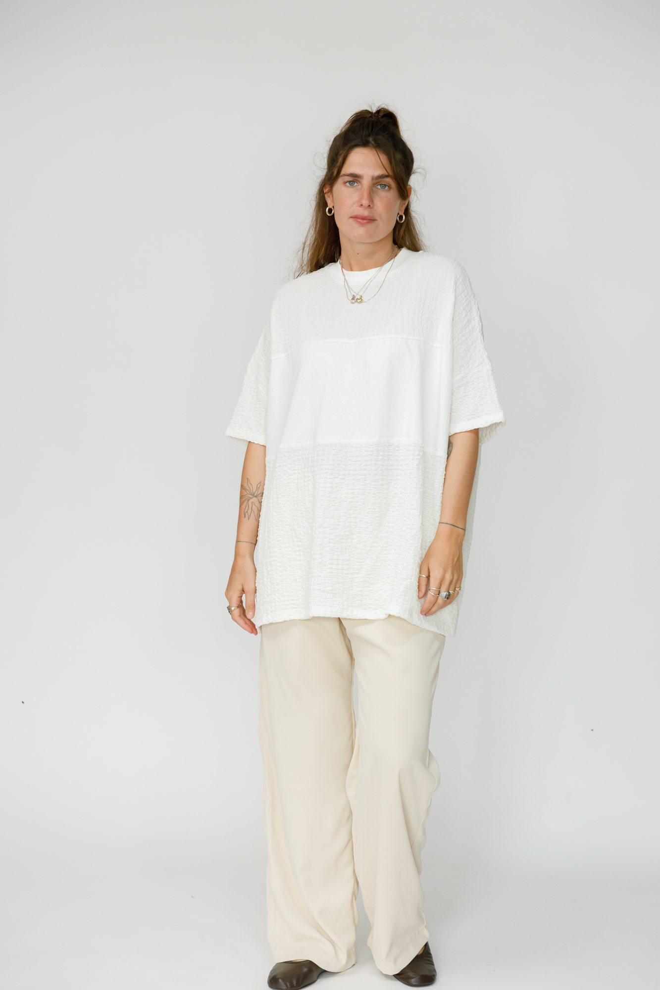 באמצע החולצה פס מלבני שמשלב בד שונה, ובנוסף שילוב של בד ריב בצווארון. הכל באותם גוונים רק הבדים שונים מה שיוצר עניין.