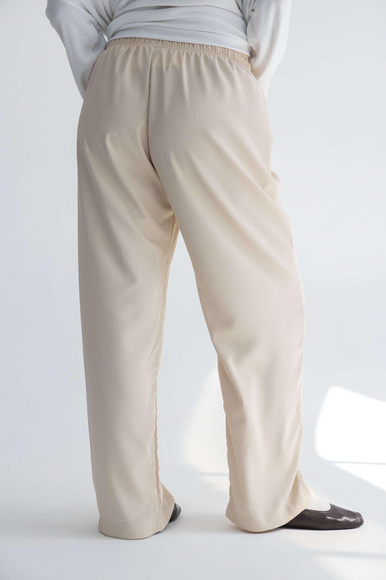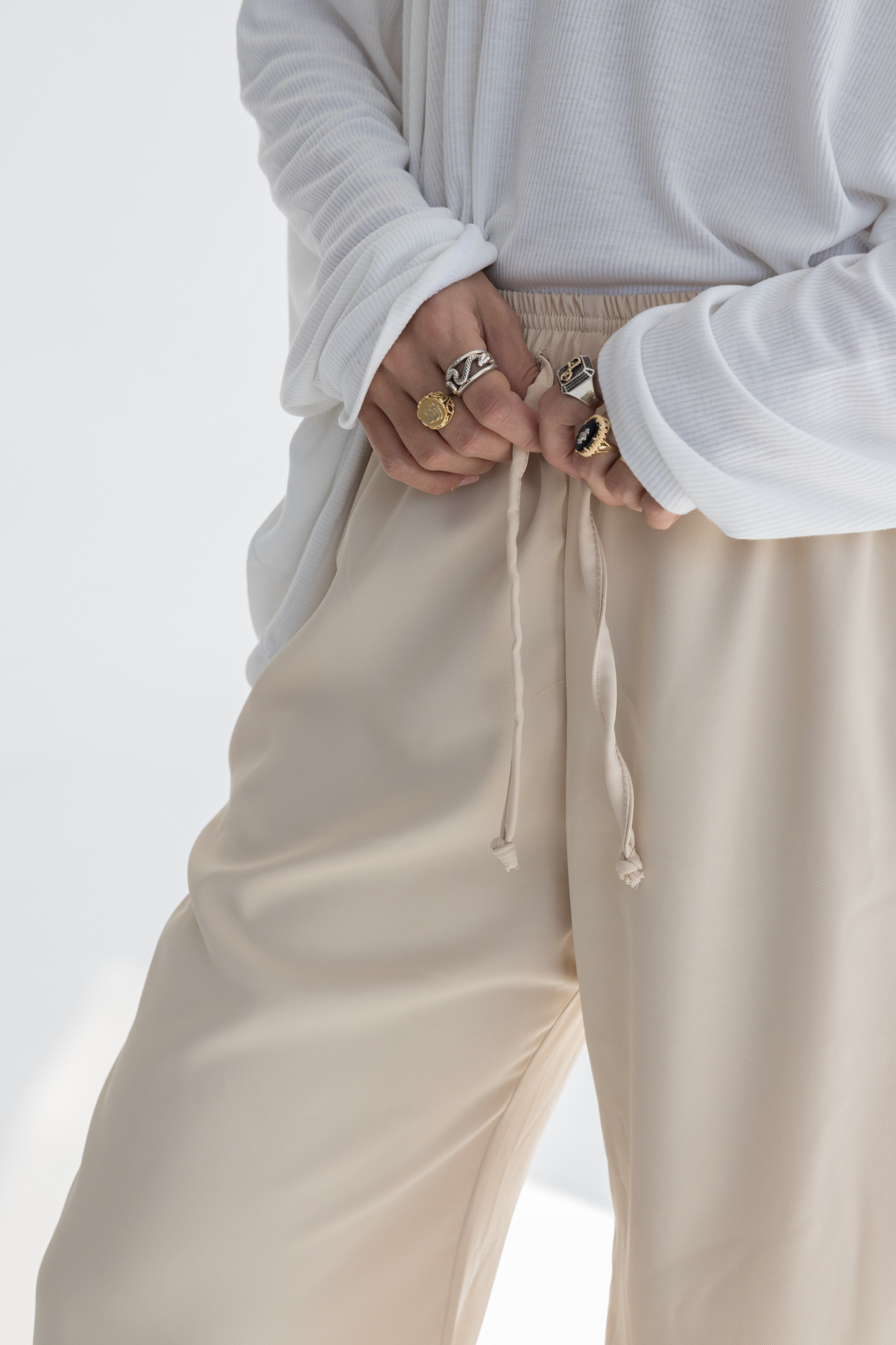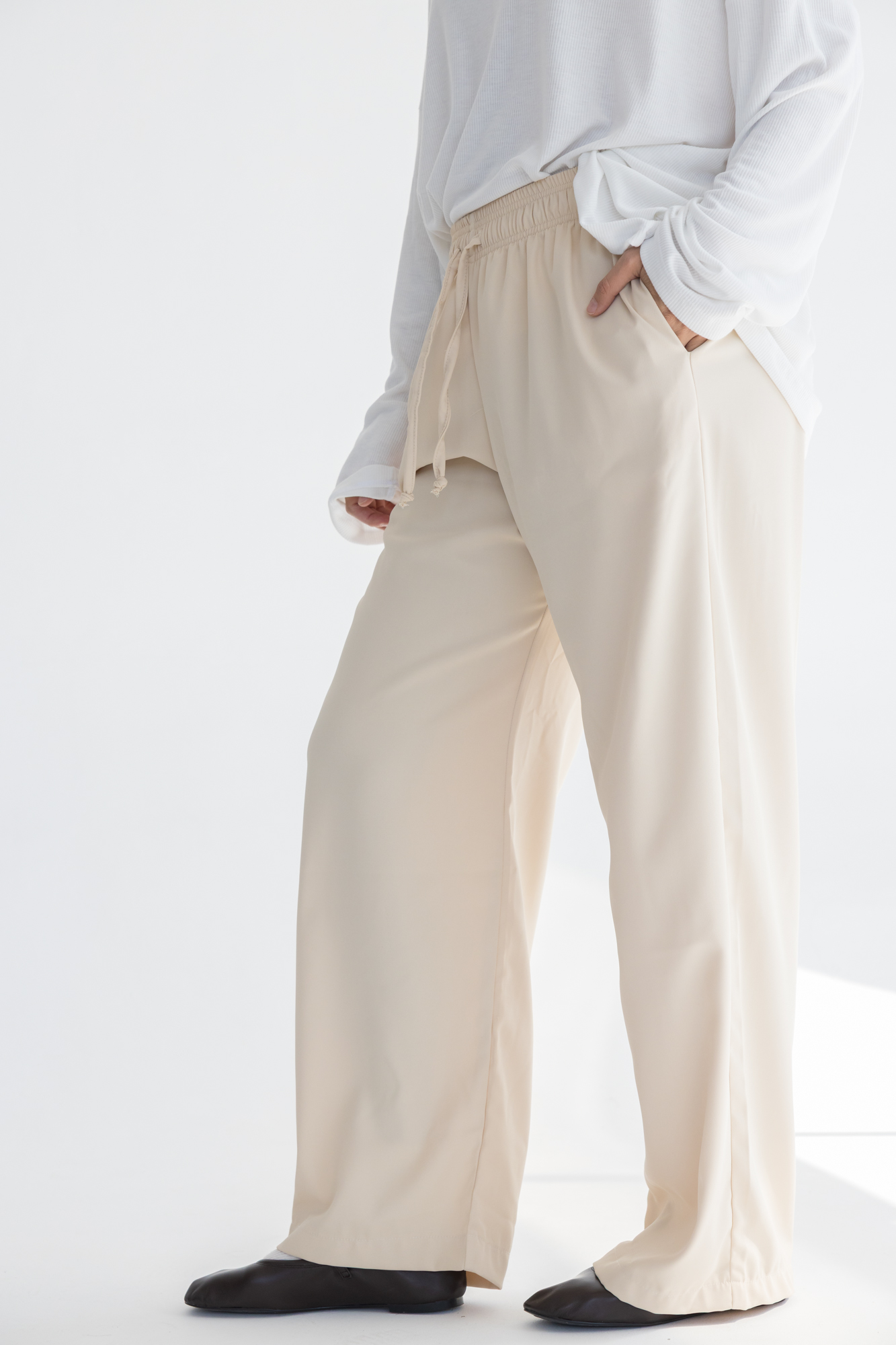 מכנסיים בגזרה רחבה, עם גומי במותן בגובה בינוני. מכנסיים נעימים ומלאים בסטייל, מתאימים לכל שעות היום.
